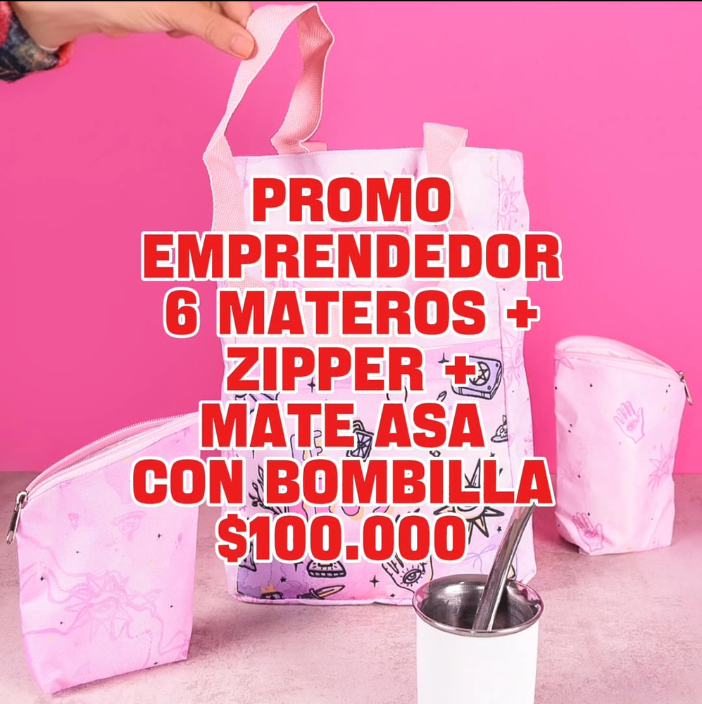 Tenes ganas de empezar a emprender y no sabes como, te traemos este super combo de 6 unidades de sets materos, incluye Bolso matero forrado con porta termo + zipper (yerbero + azucarero) + mate asa con bombilla. Se envían modelos surtidos