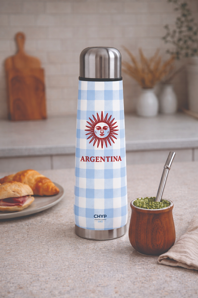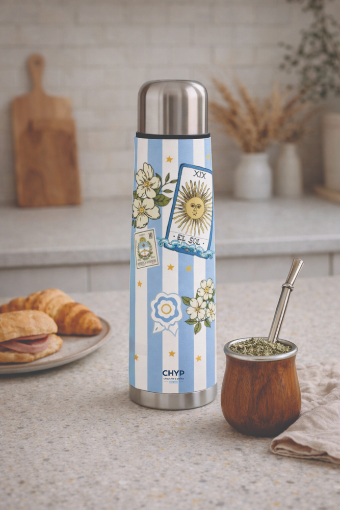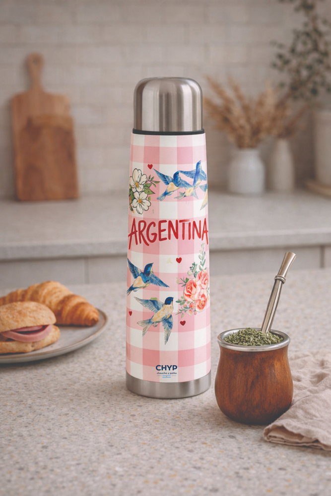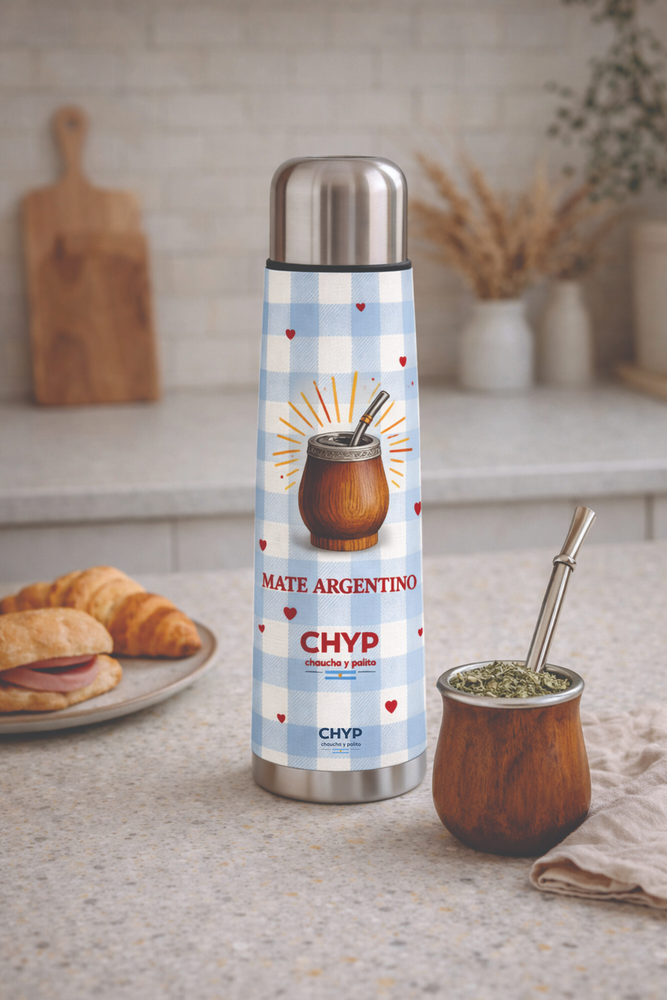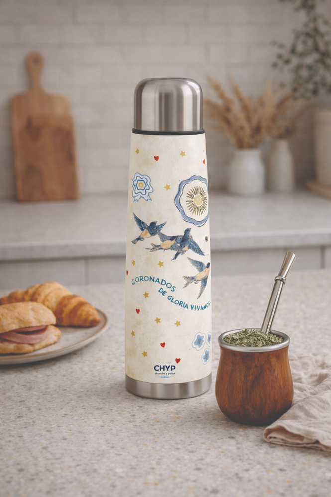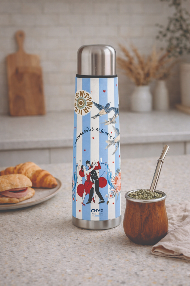 Termo de acero inoxidable doble capa con excelente conservación térmica y terminación premium.